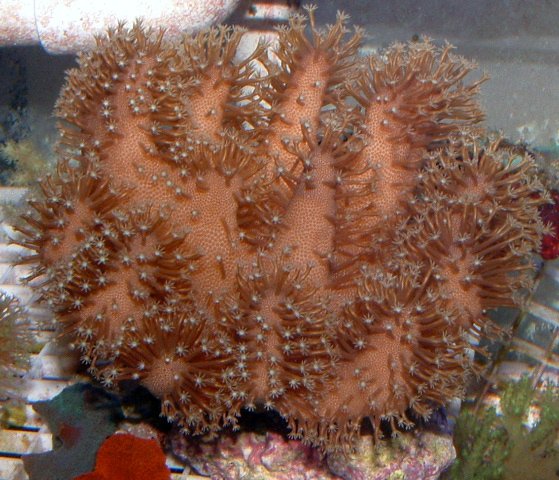 Lobophytum corals have a variety of colors, but some corals you should be able to distinguish by shade. For example, the genus will have orange, pink, green, gray, brown, cream, but L. pacuciflorum (devil's hand coral), is almost always a brownish-orange in color with white polyps. These leather corals are normally found in shallower waters, like on reef flats or near the shore. They often are exposed at low tide. This may explain their heavy mucus coatings.